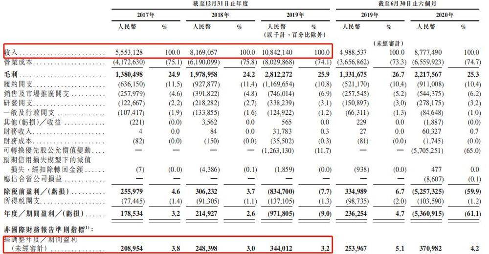 京东健康招股书显示,公司在2017年至2019年的总收入分别为55.53亿元、81.69亿元、108.42亿元,2020年上半年,京东健康的总收入约为87.77亿元;2017年至2020年上半年经调整的期间盈利分别为2.09亿元、2.48亿元、3.44亿元和3.71亿元。