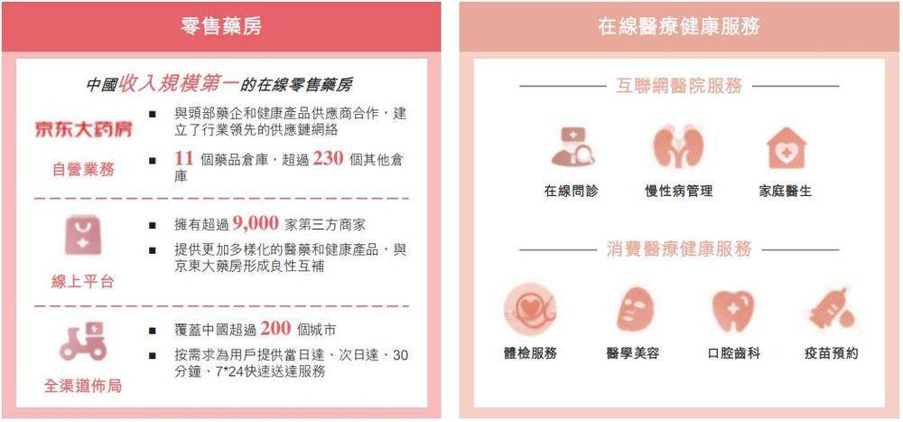 通过与京东集团合作,京东健康可利用其遍布全国的配送基础设施网络,以此实现高效的物流配送,目前公司拥有11个药品仓库和超过230个其他仓库。截至2020年6月30日,京东健康的O2O业务(即全渠道布局)已经覆盖了超过200个城市。