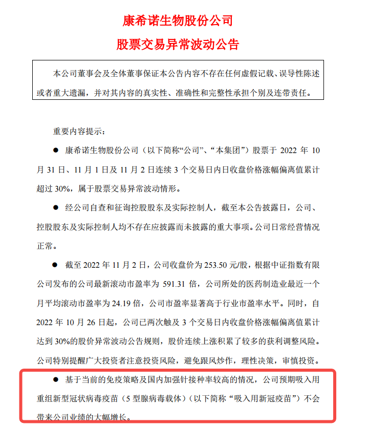 11月2日,康希诺:公司关注到,近期媒体对公司吸入用新冠疫苗较为关注,因吸入用新冠疫苗商业化进程的推进,其逐步于全国多个省市可进行预约并使用,多篇新闻对相关情况进行了报道。基于当前的免疫策略及国内加强针接种率较高的情况,公司预期吸入用重组新型冠状病毒疫苗(5型腺病毒载体)(简称“吸入用新冠疫苗”)不会带来公司业绩的大幅增长。