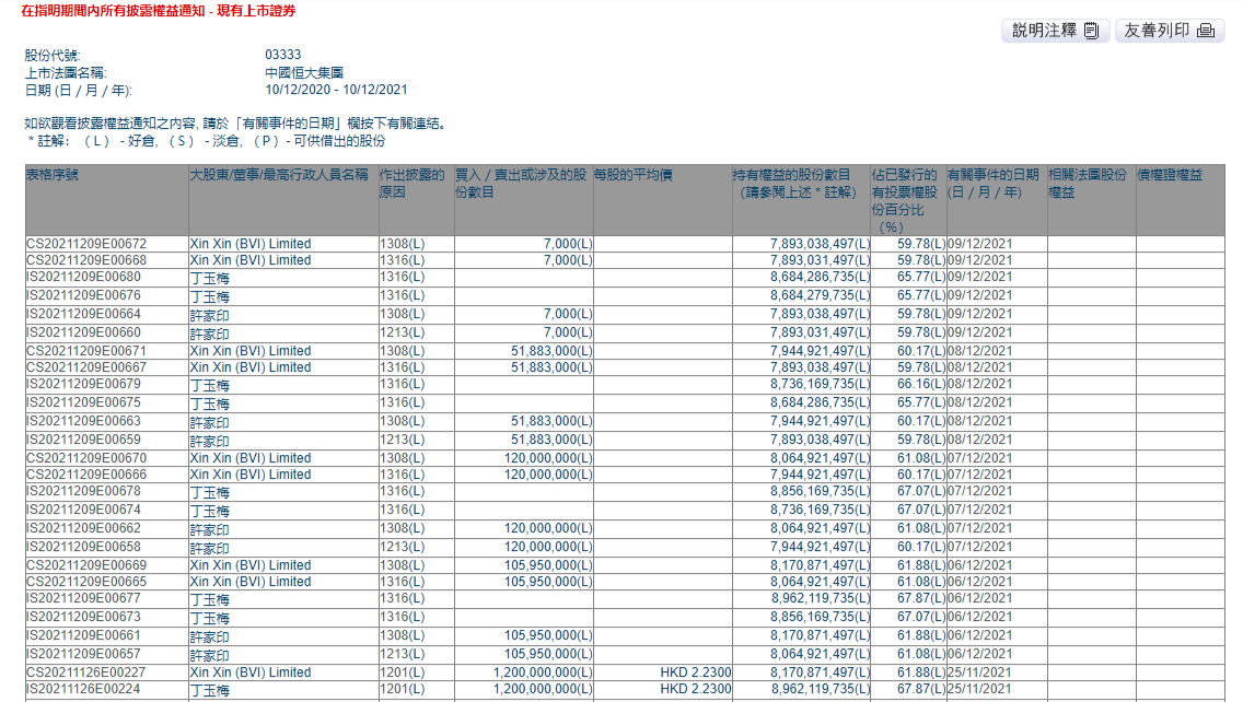 12月10日讯,据港交所文件:依据强制处置事项,许家印2.778亿股恒大股份被出售,持股比例从61.88%降至59.78%。