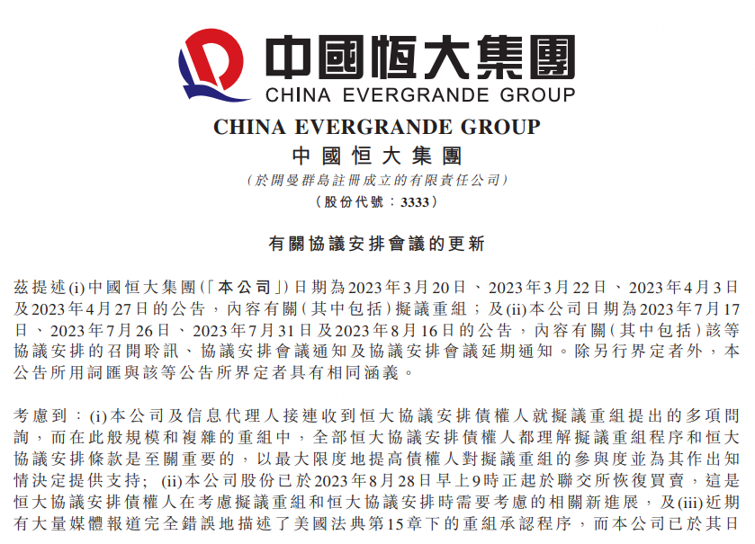 8月28日,中国恒大港交所公告称,公司决定延长供恒大协议安排债权人考虑、理解和评估恒大协议安排条款的期限,并给予恒大协议安排债权人更多时间考虑本集团近期发展,因此,恒大协议安排会议将延期29天至9月26日举行。为尽可能使恒大协议安排、景程协议安排和天基协议安排的时间表保持一致,景程协议安排会议和天基协议安排会议将延期28天至9月25日举行。
