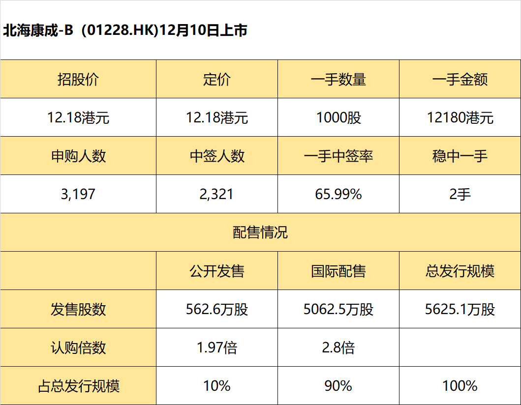 12月9日,北海康成-B发布公告,公司全球发售5625.1万股股份,其中香港发售股份562.6万股,国际发售股份5062.5万股,另有15%超额配股权;发售价每股发售股份12.18港元,每手买卖单位1000股;摩根士丹利及Jefferies为联席保荐人;预期股份将于2021年12月10日于联交所主板挂牌上市。