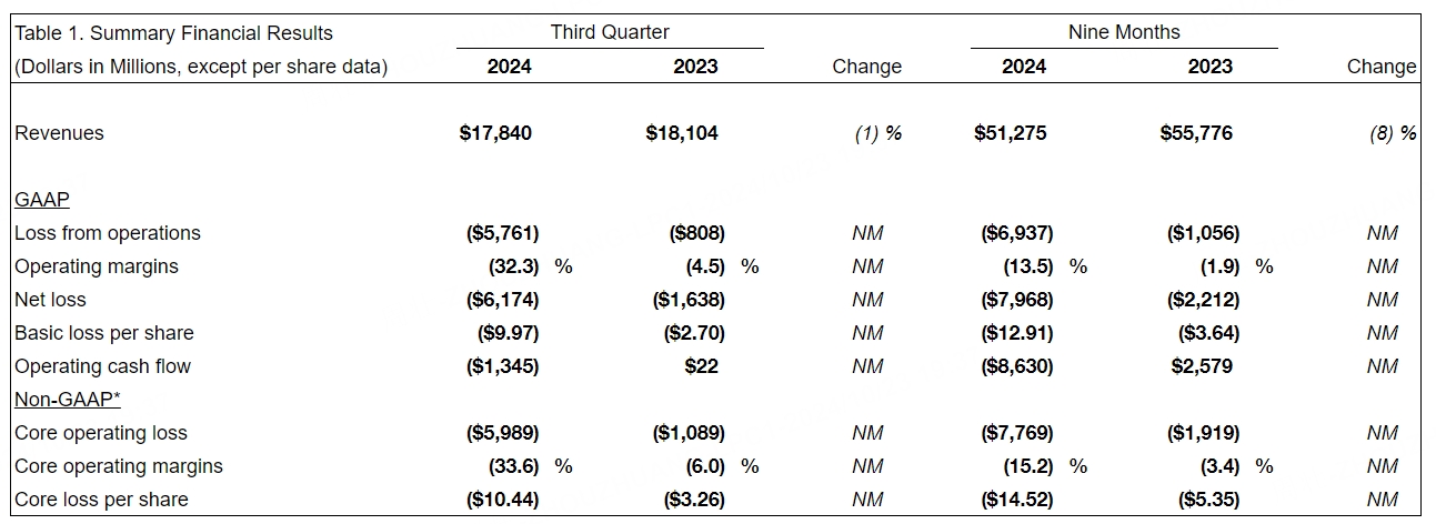 10月23日,波音发布2024年第三季度业绩。财报显示,第三季度营收178.4亿美元,同比降1%,市场预估178.9亿美元;第三季度净亏损61.74亿美元,上年同期亏损16.38亿美元;第三季度核心每股亏损10.44美元,预估每股亏损10.31美元。