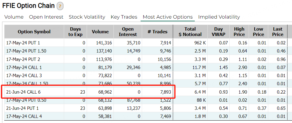 期权方面,法拉第未来多空纠缠,而一份6月21日到期的高达6美元的CALL单十分引人瞩目。一个月内再翻6倍?