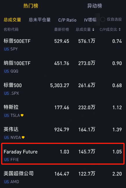 热门榜单上,法拉第未来的成交量仅次于特斯拉、英伟达,高居个股第三位。