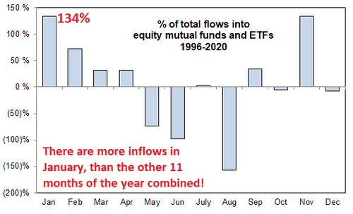 As Rubner explains, there are two key pillars to his thesis. First is that global equities have seen more inflows in 2021 than in the past 25 years combined, a dynamic that "needs to change before a larger correction can occur." The second, and more important catalyst, is that January is the month when most of the capital is deployed, i.e., "January typically sees 134% of inflows (the rest of the 11 months -34%)." And with every private wealth manager in the world right now pitching increased allocations into equities (out of cash and out of bonds), Goldman calculates that keeping 2021 pace, "This would be $125BN worth of inflows quickly in January."