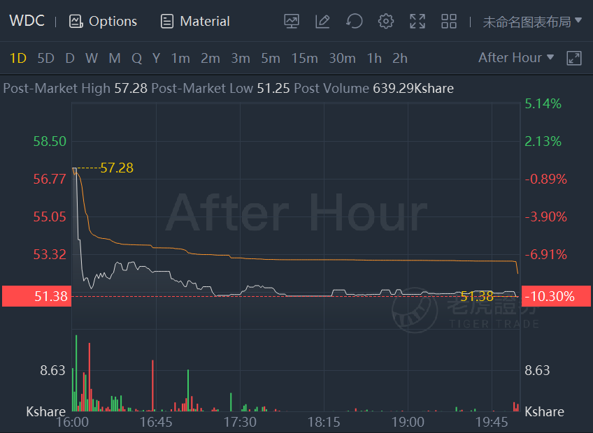 Western Digital (ticker: WDC) stock in after-hours trading fell 10.3% to $51.38.
