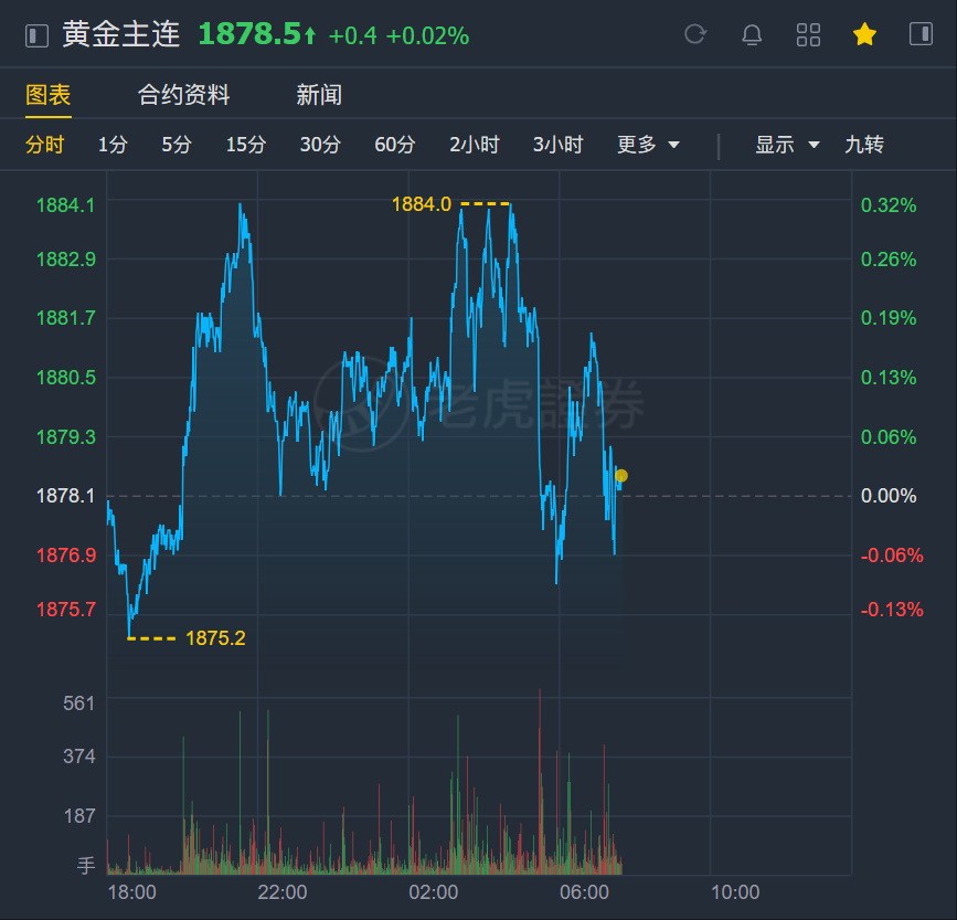 国际黄金微幅上涨,截止发稿,涨0.02%,报1878.5美元/盎司。