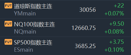美国股指期货微涨,截至发稿,道指期货涨0.07%;标普500指数期货涨0.10%;纳斯达克100指数期货涨0.08%。