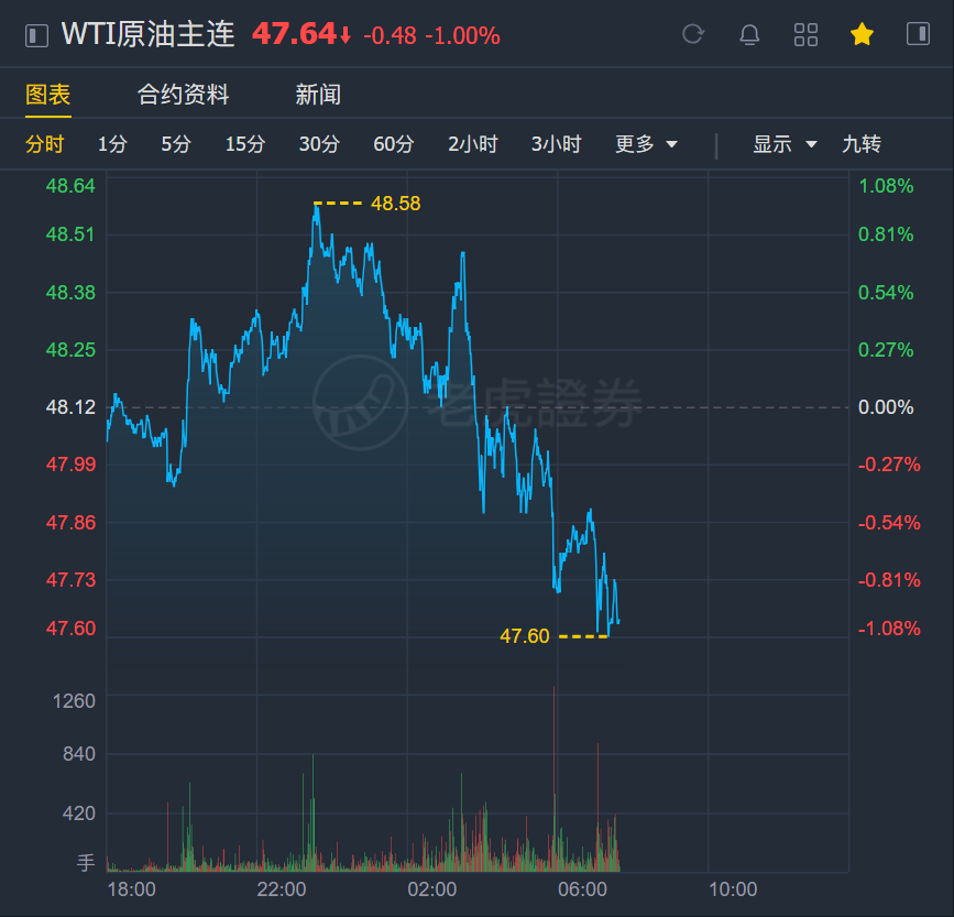 美、布两油均跌1%,截止发稿,WTI原油报47.64美元/桶;布伦特原油报50.69美元/桶。
