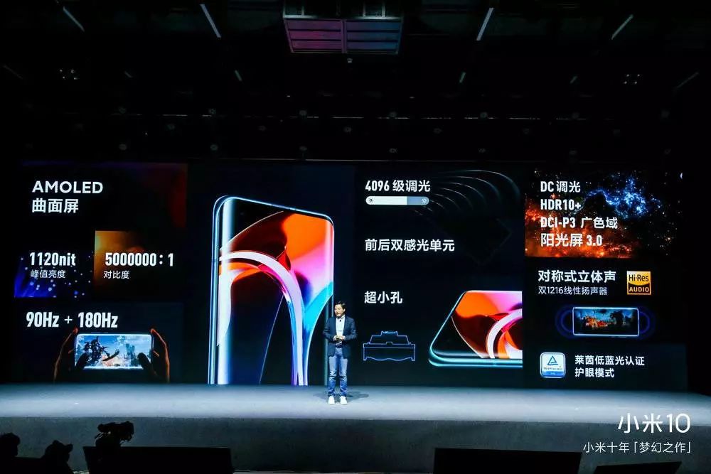 其实小米 10 的配置已经被曝光得差不多,外观方面惊喜不算多,6.67 AMOLED 曲面屏,3.84mm 挖孔,屏幕 800nit 亮度,1200 nit 峰值亮度,90Hz 刷新率,180Hz 的触控采样率,COP 工艺的 3.32mm 的下巴,重量 208g,厚度 8.96mm,不算轻薄,这不是小米 10 的主打卖点。