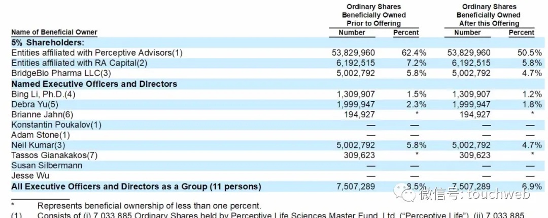 IPO后,Perceptive Advisors持股为50.5%,RA Capital持股为5.8%,BridgeBio Pharma持股为4.7%。