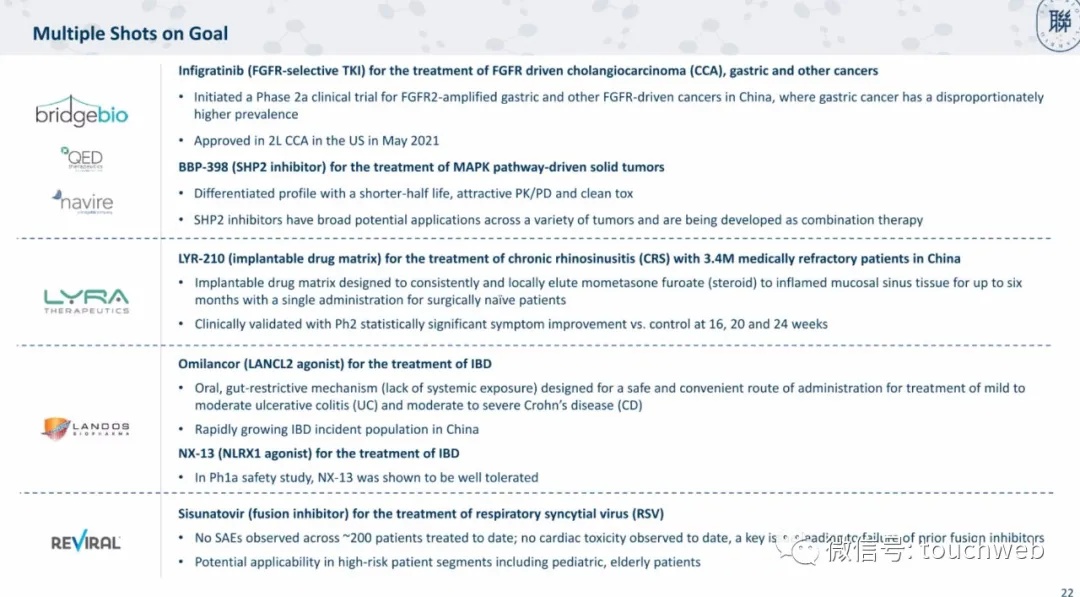 联拓生物成立之初,BridgeBio Pharma就宣布与联拓生物达成合作,将其管线拓展至中国。合作初期将专注于BridgeBio公司研发的两款肿瘤产品,包括现正进行3期临床试验的选择性FGFR抑制剂infigratinib,以及治疗因RAS和酪氨酸激酶受体导致的实体肿瘤的SHP2抑制剂BBP-398。