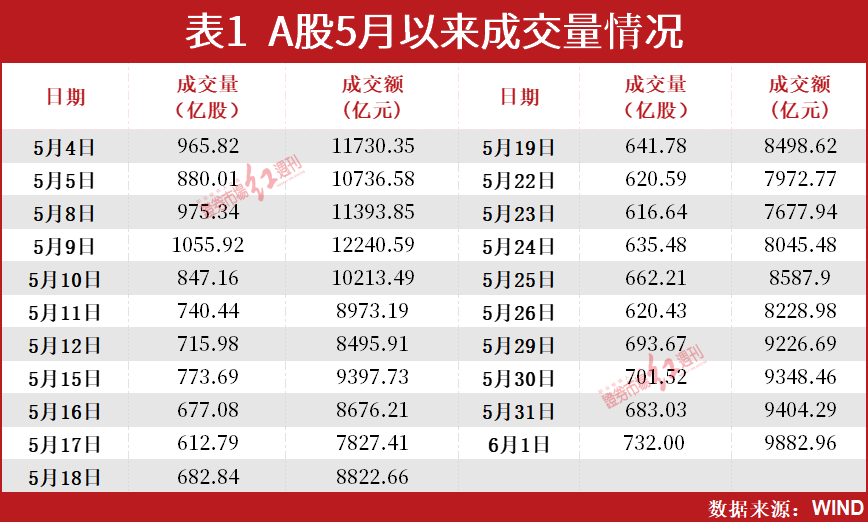 也是从这一日起,上证指数由阶段新高持续调整,至5月25日一度下跌至3168.57点,跌幅超过7%。在此背景下,市场也开始变得惜买惜卖,如自5月10日之后,A股成交额始终维持在万亿元以下(见表1),赚钱效应明显降低。