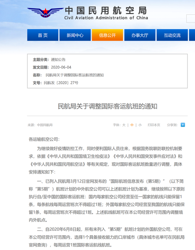6月4日上午,民航局发布的公告果然仍然坚持“五个一”政策,但是放开了“第5期”这一先决条件。民航局称,自2020年6月8日起,所有未列入“第5期”航班计划的外国航空公司,可在本公司经营许可范围内,选择1个具备接收能力的口岸城市(具体城市名单可在民航局官网查询),每周运营1班国际客运航线航班。