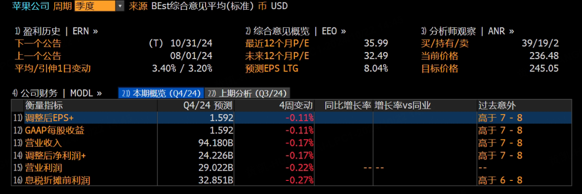苹果将于美东时间10月31日盘后发布2024财年第四财季财报。根据彭博分析师预期第四财季营收为942亿美元,同比增长5.3%。调整后EPS为1.59美元,同比增长5.8%。