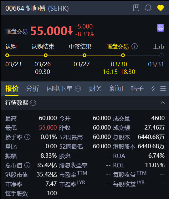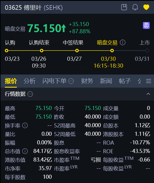 3月30日,傅里叶暗盘飙涨近88%,总市值超84亿港元,每股定价40港元,每手100股;铜师傅暗盘跌超8%,总市值超35亿港元,每股定价60港元,每手100股;将于3月31日(周二)正式在港交所挂牌交易。