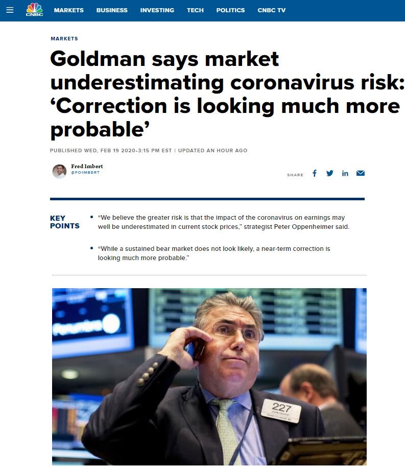 CNBC: 高盛:市场低估了新冠病毒的风险 美股调整可能性大增