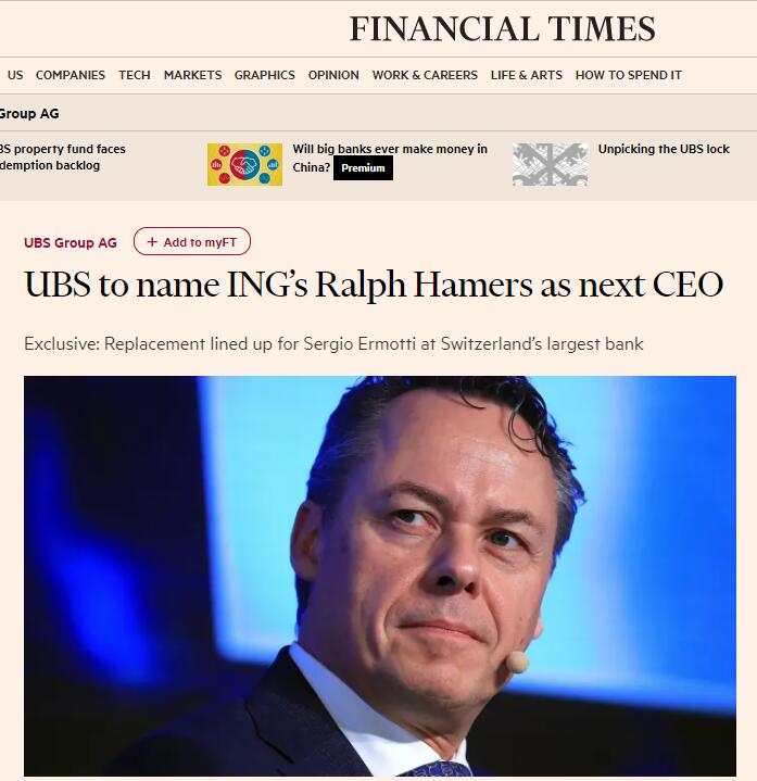 知情者称,瑞士最大银行瑞银将任命荷兰金融巨头ING的CEO Ralph Hamers为下任瑞银的CEO,取代执掌瑞银八年多的现任CEO Sergio Ermotti。