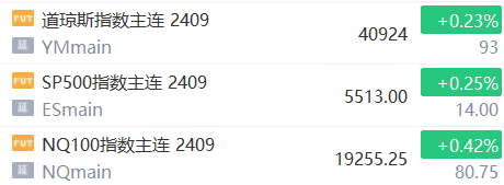 美股三大股指期货上涨,截至发稿,道指期货涨0.23%,纳斯达克100指数期货涨0.42%,标普500指数期货涨0.25%。