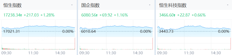 港股三大指数整体表现强势,午后稍有回落,恒指、国指一度大涨2%,最终分别收涨1.28%及1.16%,恒生科技指数涨0.66%,三大指数较上周出现明显止跌回升迹象。