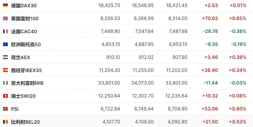 欧洲主要指数涨跌不一,德国DAX30涨0.01%,英国富时100涨0.85%,法国CAC40跌0.38%。