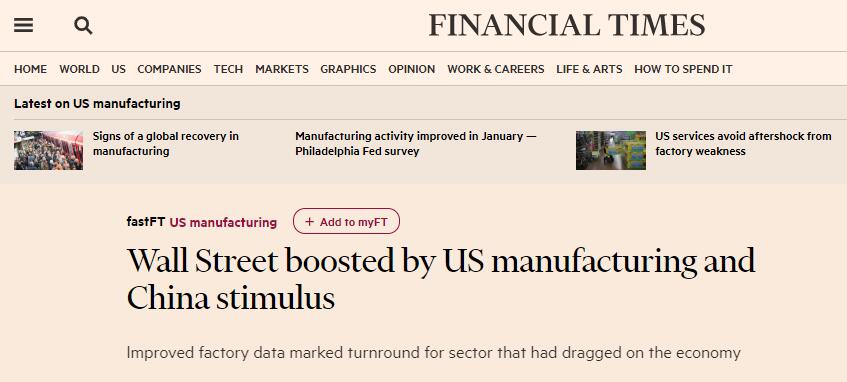 金融时报 | 受美国制造业指数和中国刺激推动 美股反弹
