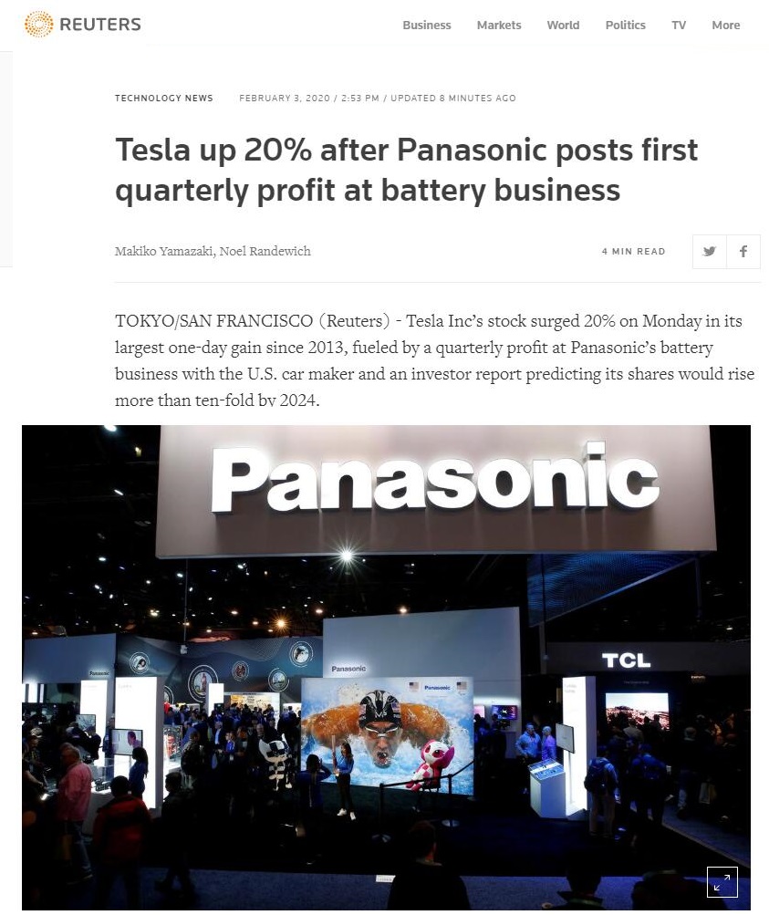路透社 | 松下公布电池业务首次季度盈利后 特斯拉股价大涨20%
