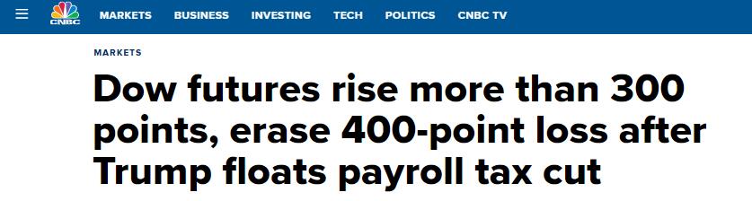 CNBC:特朗普宣称将下调工资税后 道指期货反弹300多点抹平稍早跌幅;白宫邀请华尔街高管们开会讨论新冠肺炎疫情