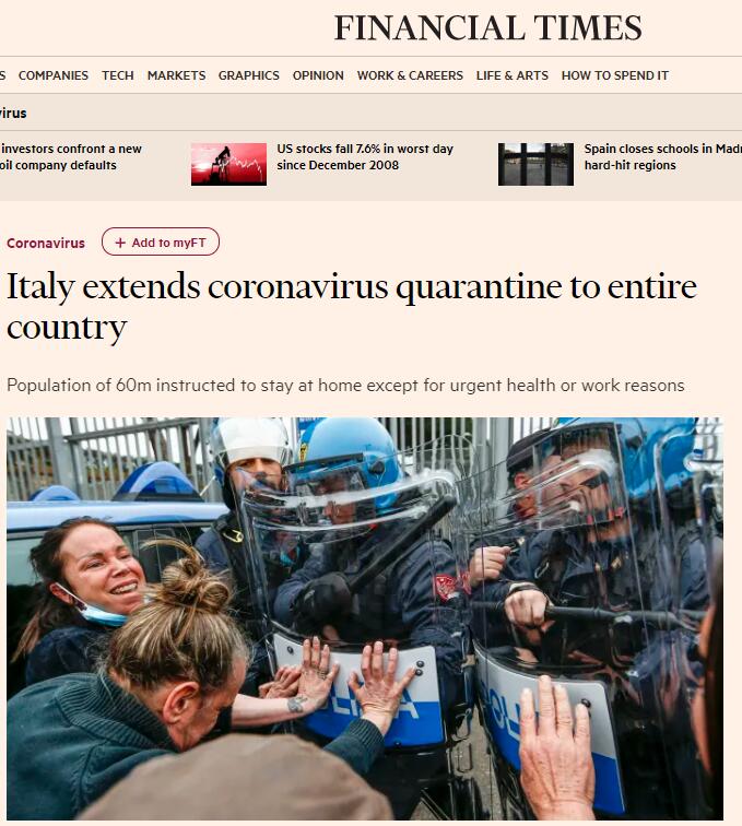 金融时报: 意大利将新冠病毒隔离令扩大到全国