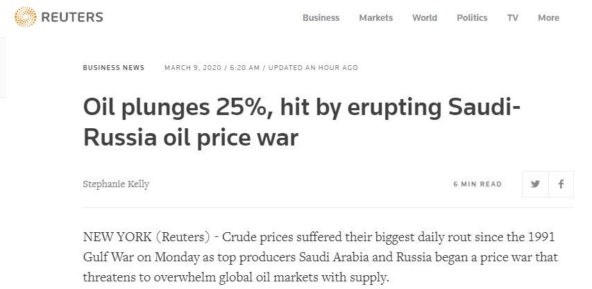路透社: “沙俄”价格战重创 原油狂跌近25%