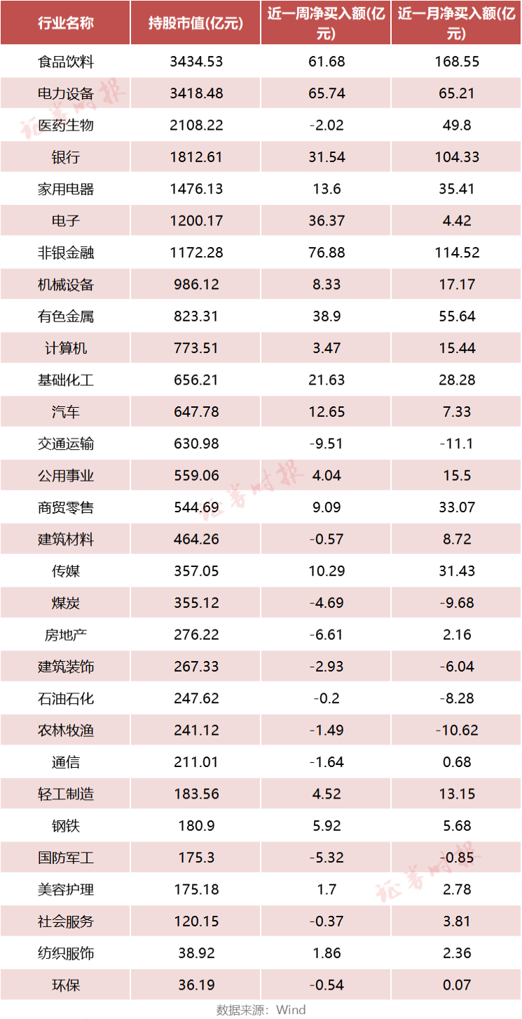Wind数据显示,截至目前,北向资金持仓食品饮料、电力设备两大行业的市值均超3400亿元,医药生物持仓市值达2108.22 亿元,银行、家用电器、电子、非银金融等超1000亿元。