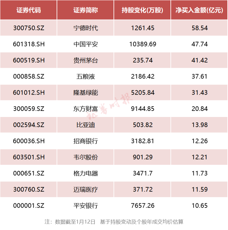 具体来看,截至1月12日,北向资金开年以来净买入金额居前的股票主要有宁德时代、中国平安、贵州茅台、五粮液、隆基绿能等,其中,宁德时代获净买入金额达58.54亿元。