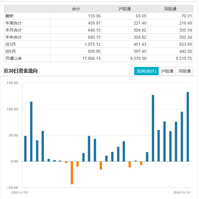 1月13日,北向资金净买入133.36亿元,刷新年内净买入纪录。今年以来,北向资金合计净买入640.15亿元,而2022年全年,北向资金净流入额为900.20亿元。