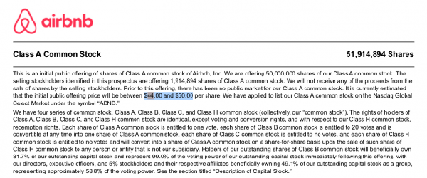 12月2日消息,Airbnb更新招股书至“S-1/A”,预计首次公开发行价格将以44美元~50美元之间的价格发行约5600万只股票,以最高50美元/股计算,总发行约28.45亿美元,对应估值达到348亿美元,股票代码ABNB。