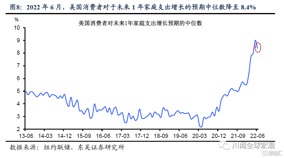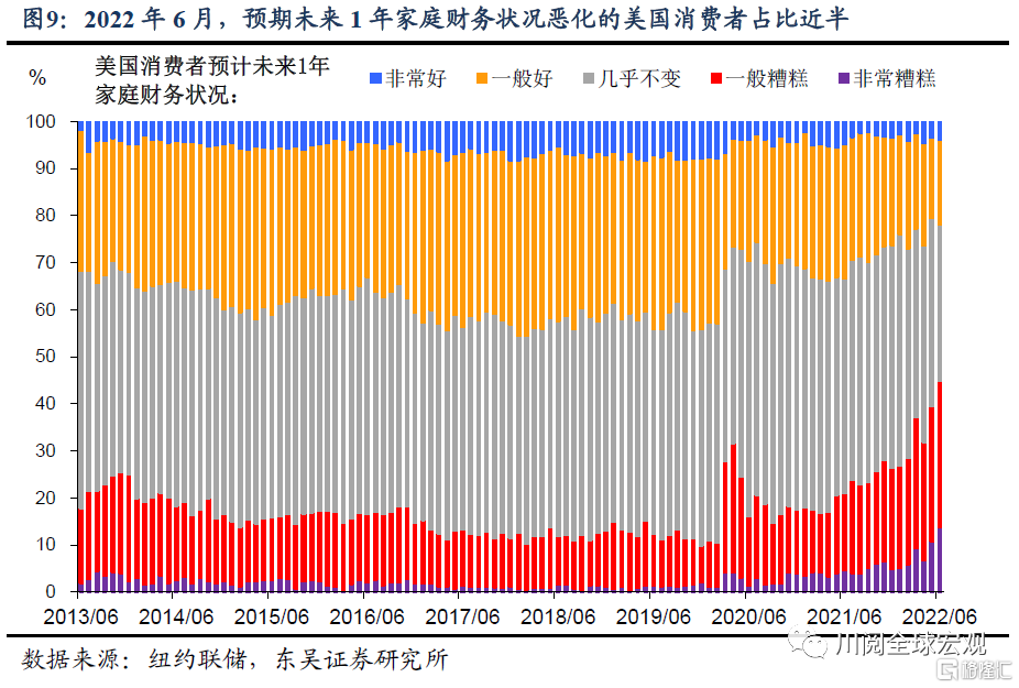 一是消费者预期的恶化预示着需求将放缓。消费者预计家庭支出增速放缓,7月11日发布的纽约联储调查显示,6月美国消费者对于未来1年家庭支出增长的预期中位数降至8.4%(5月为9.0%);而预期未来1年家庭财务状况恶化的消费者占比近半,高于5月(图8-图9)。需求端的放缓将传导至生产端,并终将反映在企业对于劳动力需求的下降,这也意味着就业指标是滞后于经济周期的。