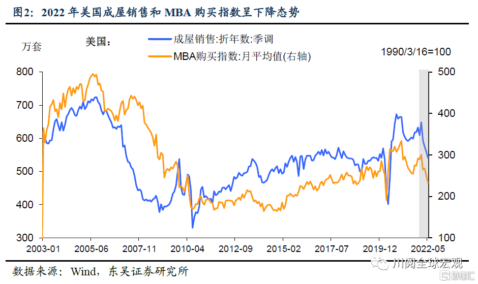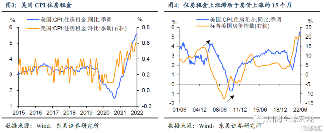 我们此前的报告指出,住房租金上涨滞后于房价上涨约15个月,而标普美国房价指数于2021年5月起出现跳升,9月上涨动能才减弱(图4)。因此我们预计2022年下半年住房租金增速难减,而加息导致的住房市场降温要到2023年年中才能有所体现。