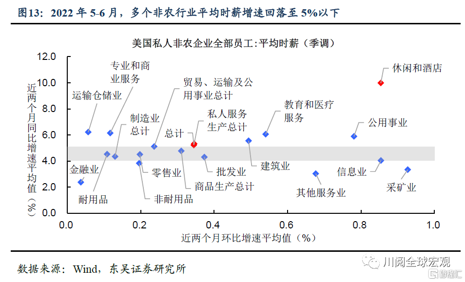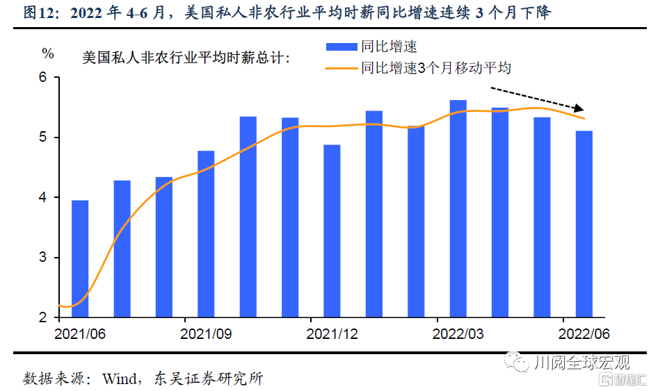 三是7月薪资增速有望回归5%以下。如图12-图13所示,2022年4-6月,美国私人非农行业平均时薪同比增速连续3个月下降,6月录得5.11%,若7月维持此前的下行态势,则有望跌破5%,而5-6月多个行业的同比增速已经回归至5%以内,显示出薪资增速已经放缓。