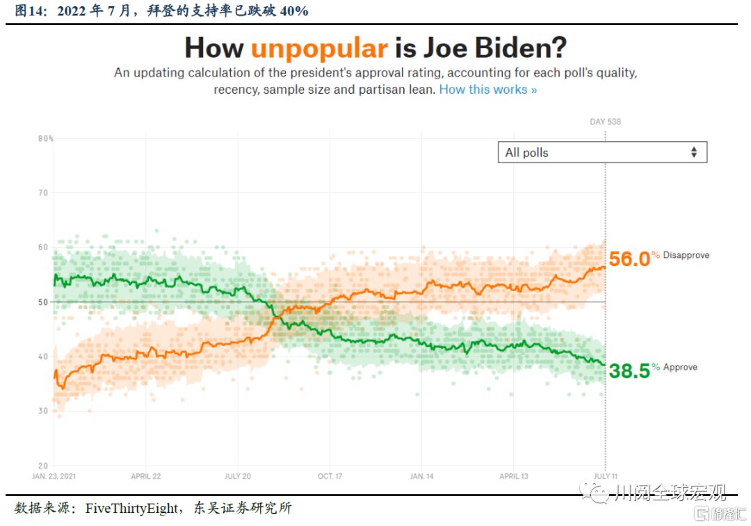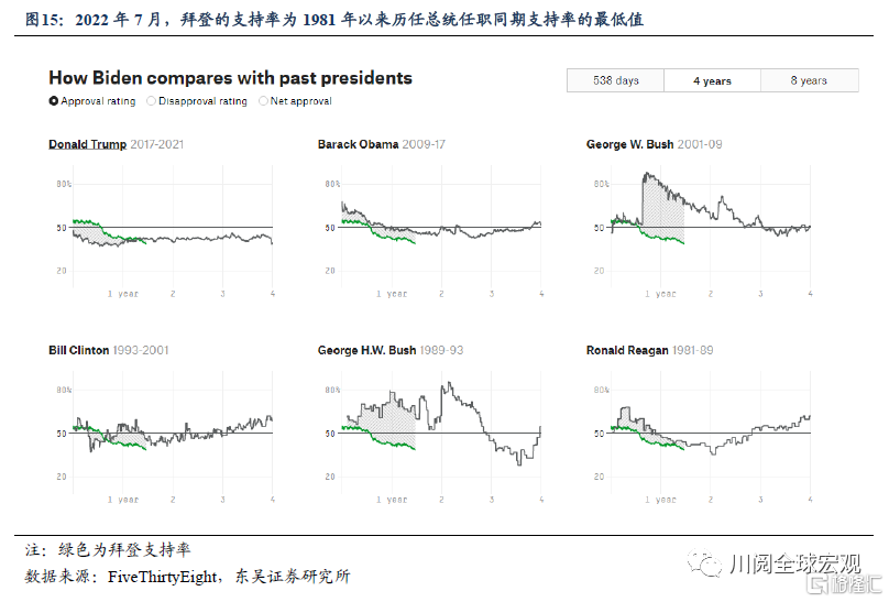 不过随着中期选举的临近,留给美联储压制通胀的时间已经不多了。高涨的通胀下,拜登的支持率已跌破40%,并且为1981年以来历任总统任职同期支持率的最低值,甚至不及前任总统特朗普(图14-图15)。美联储面临的政治压力加大,加息的决心也将更大,而美国经济的衰退可能早在三季度末便到来。