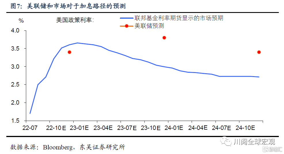 由此看来,75bp为7月议息会议加息的下限。通胀数据公布后,联邦基金利率期货对于7月加息的预期由此前的75bp升至90bp,对年末利率终值的预期升至3.7%,高于6月美联储3.4%的指引(图7)。