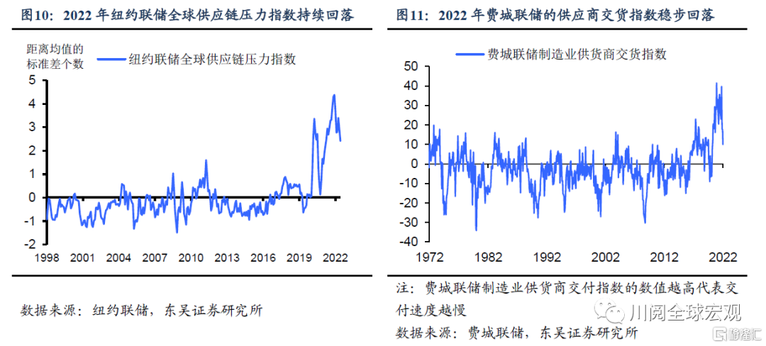 二是供应链扰动逐步缓解。纽约联储供应链压力指数已从2021年12月的距离均值4.4个标准差回落至2022年6月的2.4个标准差,费城联储的供应商交货指数也稳步回落,意味着交付时间逐渐缩短(图10-图11)。