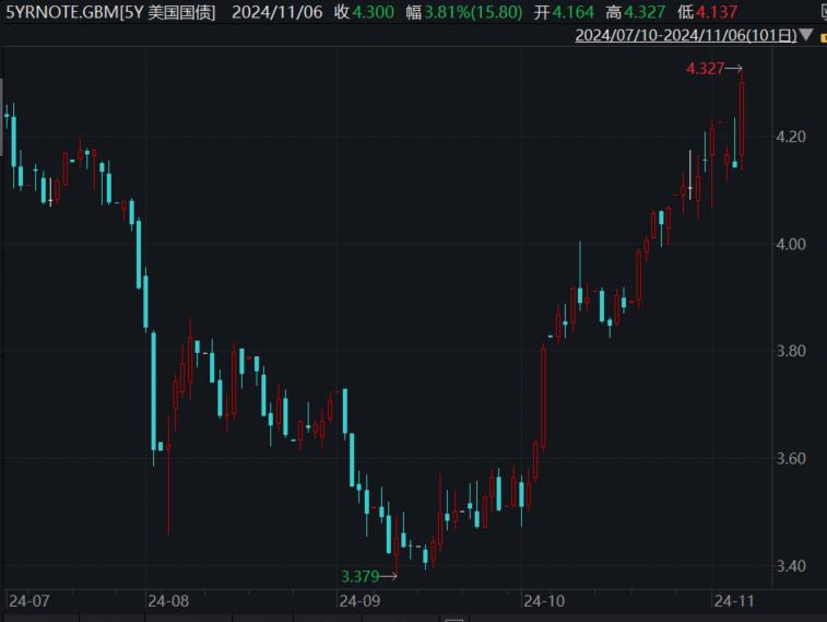 不过,多数机构预计,美联储可以向投资者发出一个令人放心的信息:尽管最近国债收益率有所上升,但利率仍有望走低。11月6日,美国主要期限国债收益率持续走高。其中,5年期美债收益率创4个月来新高。