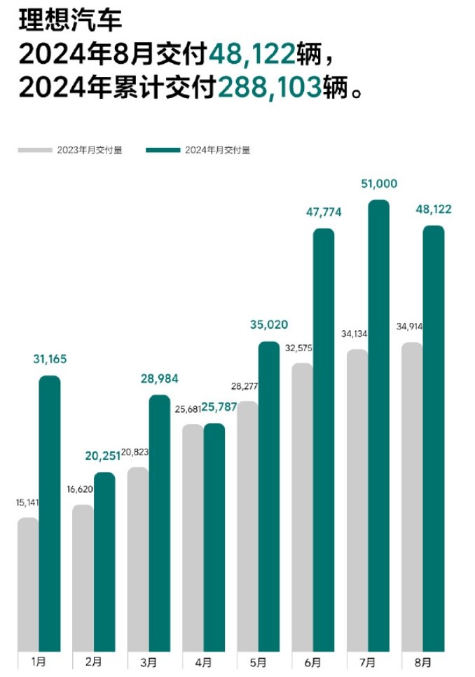理想汽车公布2024年8月交付数据,8月理想汽车交付新车48,122辆,同比增长37.8%。