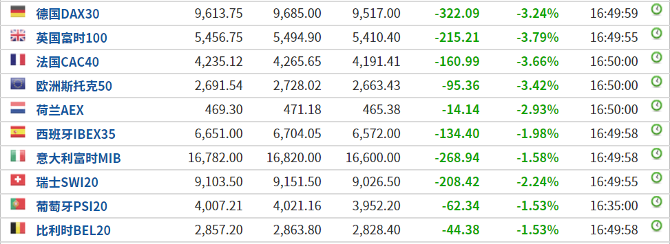 欧洲主要股指全线下挫,截止发稿,欧洲斯托克50指数跌3.42%,德国DAX指数跌3.24%,英国富时100指数跌3.79%。