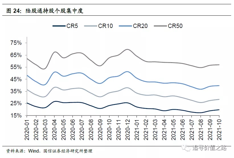 个股集中度方面,10月份陆股通持仓前五、前十、前二十、前五十个股集中度均在持续回升。具体来看,10月份个股 CR5、CR10、CR20和CR50分别为19.8%、28.3%、39.8%和57.0%,较上月分别上升了0.9、1.0、0.6、0.5个百分点。
