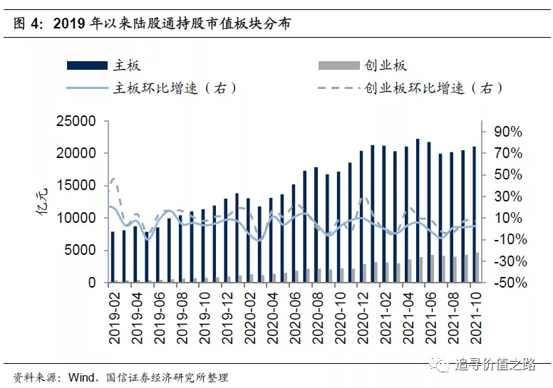 从持股市值的板块分布上看,10月陆股通持股市值在主板和创业板均有所上升,并且相较于9月而言,主板、创业板持股市值的环比增速同样小幅提高。具体来看,截至10月31日,主板持股市值为21042亿元,环比上升2.8%;创业板持股市值4651亿元,环比上升7.4%。