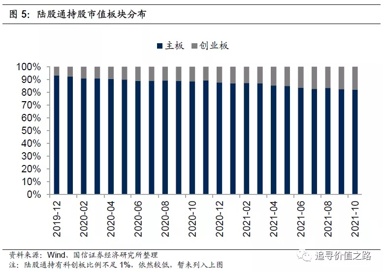从陆股通持仓占比的变化角度来看,10月份主板占比小幅下降,创业板占比小幅提高。具体而言,截至10月31日,陆股通持股总市值中,主板持股市值占81.9%,较上月下降0.6%;创业板持股市值占18.1%,较上月提高0.6%。