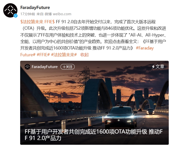 1月22日,法拉第未来宣布,FF91 2.0自去年开始交付以来,完成了首次大版本远程(OTA)升级。此次升级包括752项新增功能与846项功能优化。
