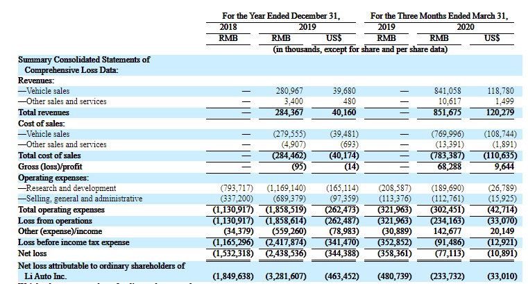 财务数据显示,在过去的2018年、2019年和2020年前三个月,理想汽车的营业收入分别为 0、2.84亿和8.52亿元人民币,相应的利润分别为-18.50亿、-32.82亿和-2.34亿元人民币。