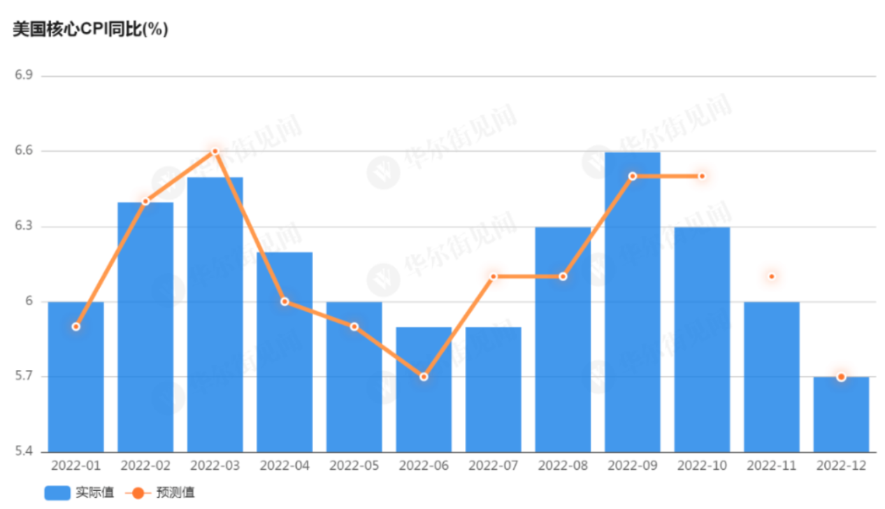 美国12月核心CPI同比涨幅5.7%,预期5.7%,前值6%。